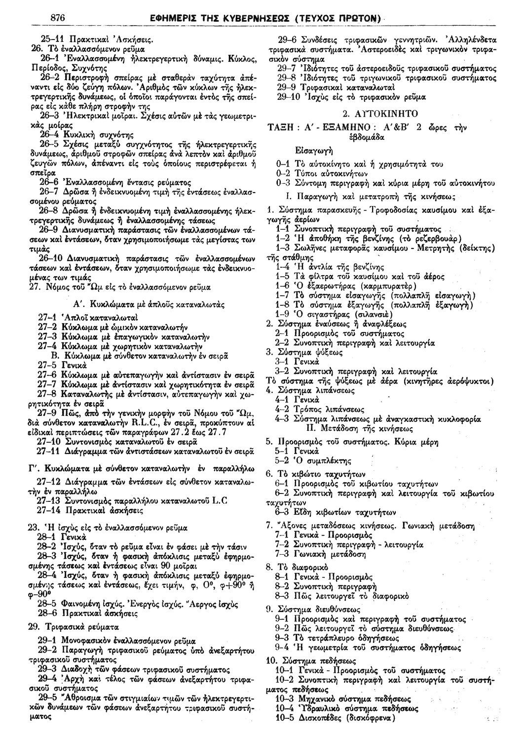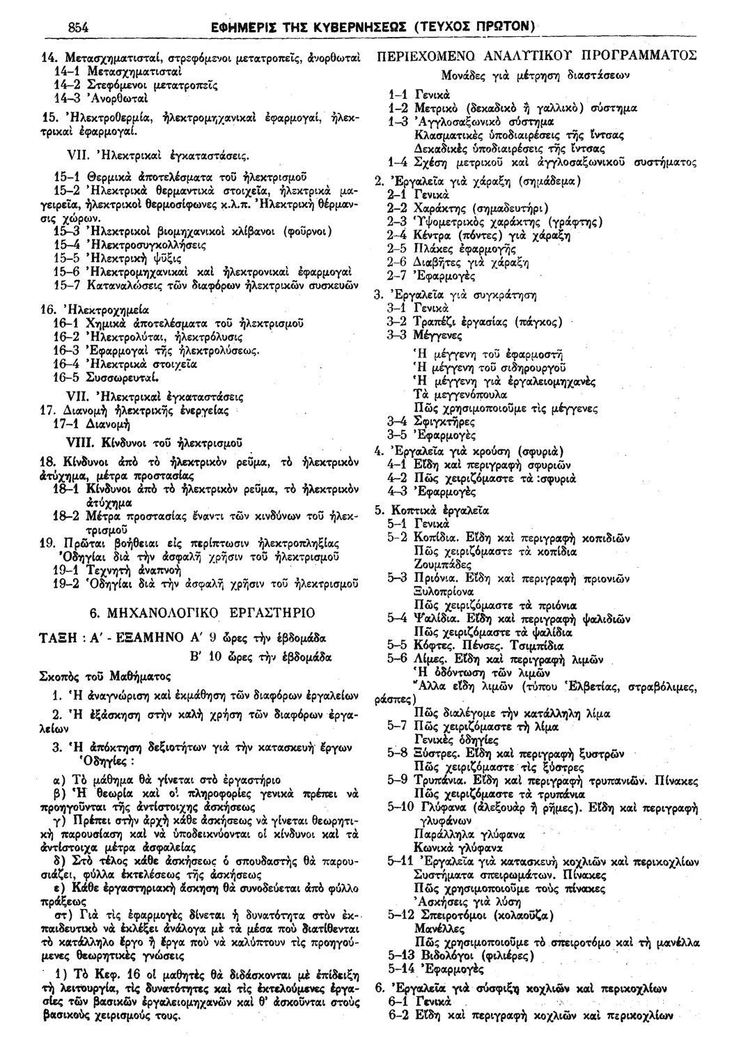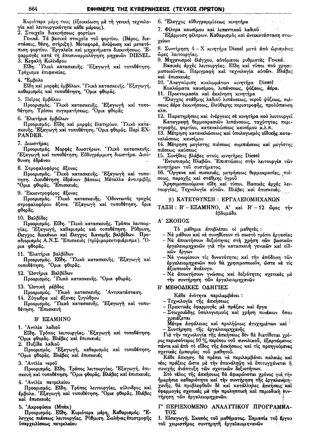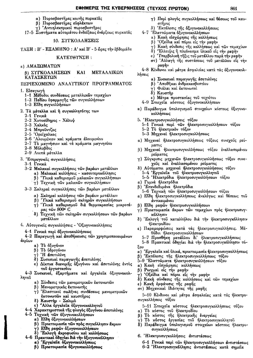 Π.Δ. 293 Περί των Ωρολογίων και Αναλυτικών Προγραμμάτων της Πρώτης (Α') και Δευτέρας (Β') τάξεως των Ημερησίων Μέσων Τεχνικών Σχολών κατά τμήμα