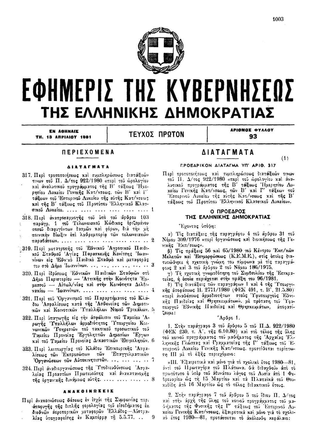 Π.Δ. 317 Περί τροποποιήσεως και συμπληρώσεως διατάξεων τινων του Π. Δ/τος 922/1980 "περί του ωρολογίου και αναλυτικού προγράμματος της Β' τάξεως Ημερησίου Λυκείου Γενικής Κατευθύνσεως, των Β' και Γ' τάξεων Εσπερινού Λυκείου της αυτής κατευθύνσεως"