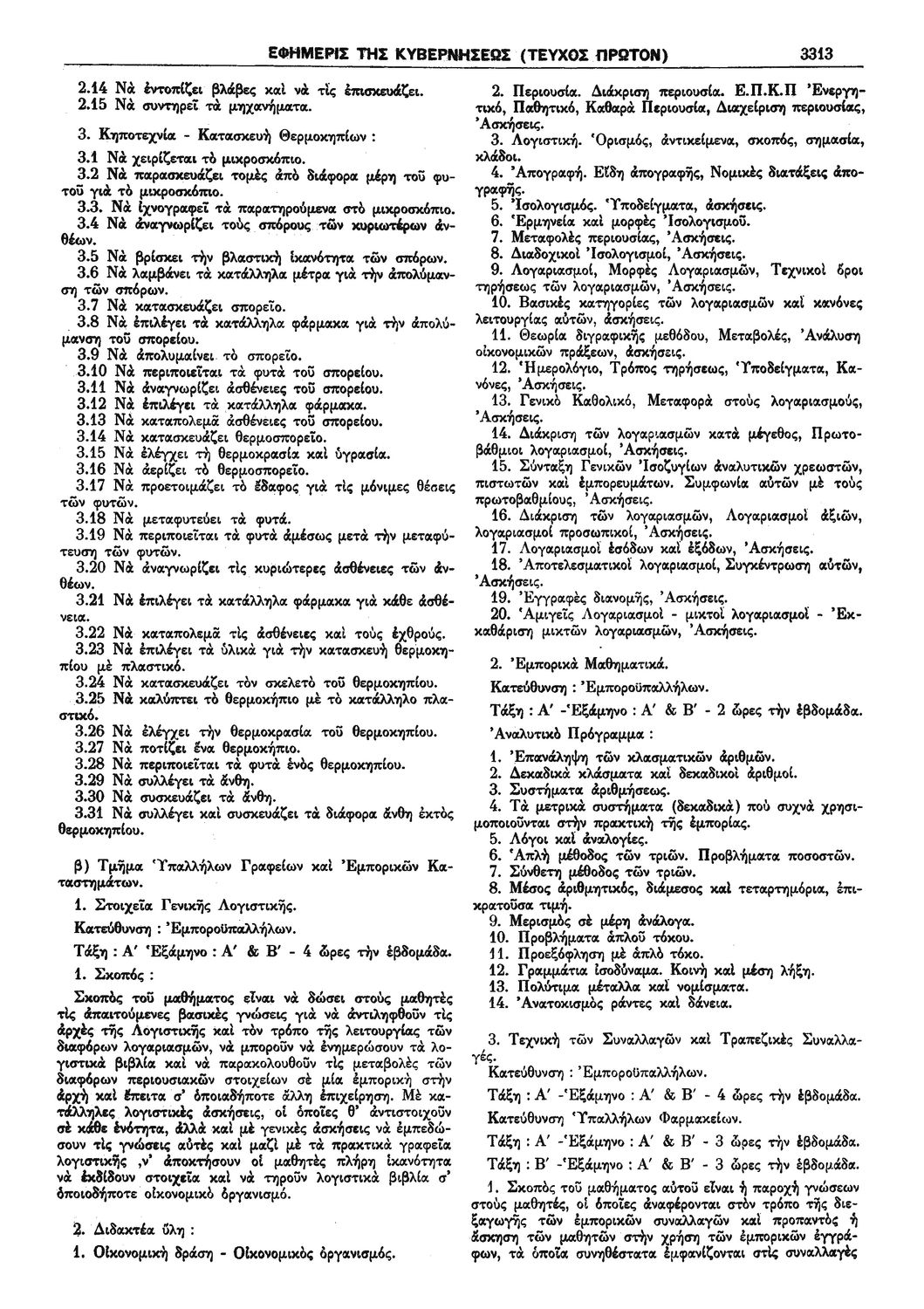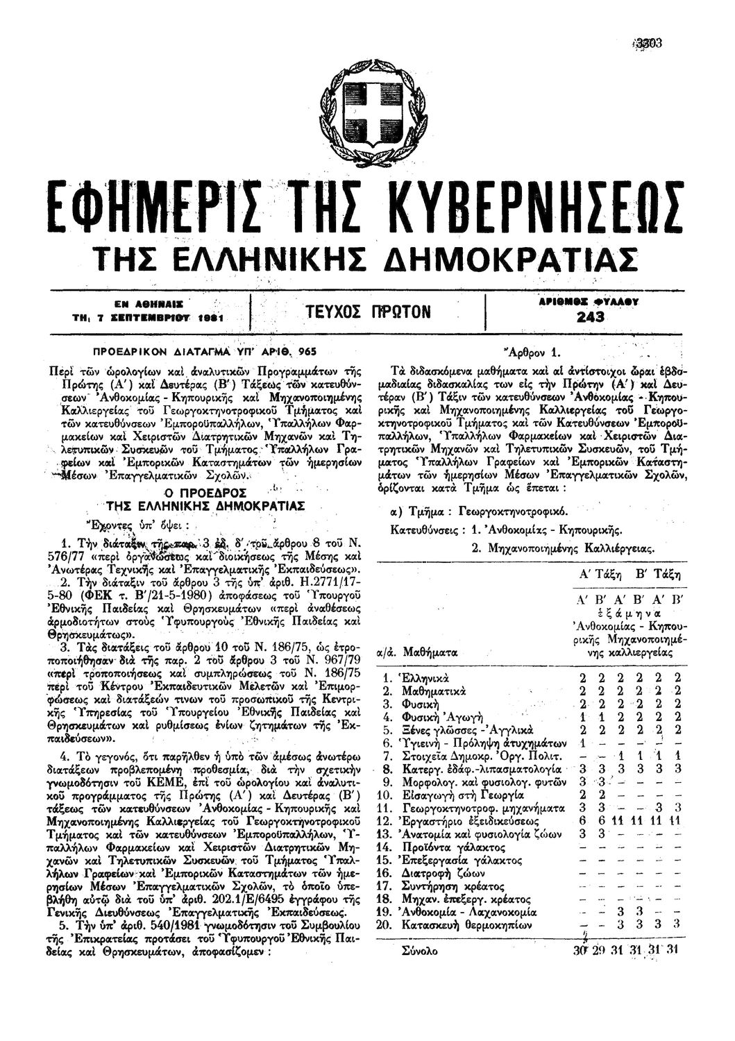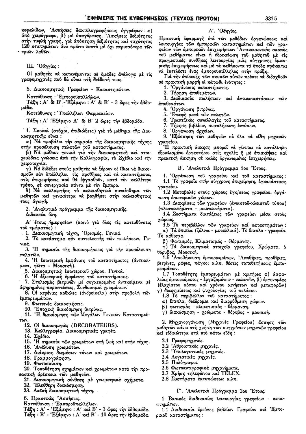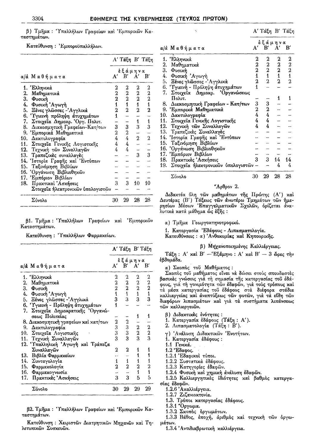 Π.Δ. 965 Περί των ωρολογίων και αναλυτικών προγραμμάτων της πρώτης και δευτέρας Τάξεως των κατευθύνσεων Ανθοκομίας - Κηπουρικής και Μηχανοποιημένης Καλλιεργείας του Γεωργοκτηνοτροφικού Τμήματος και των κατευθύνσεων Εμποροϋπαλλήλων, Υπαλλήλων Φαρμακείων και Χειριστών Διατρητικών Μηχανών και Τηλετυπικών Συσκευών του Τμήματος Υπαλλήλων Γραφείου και Εμπορικών Καταστημάτων των ημερησίων Μέσων Επαγγελματικών Σχολών.