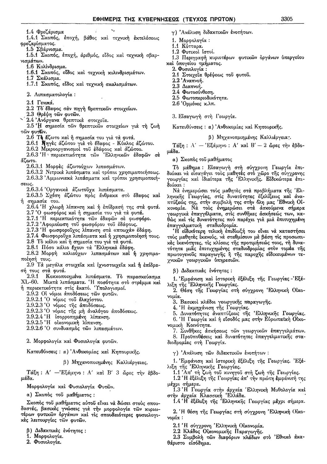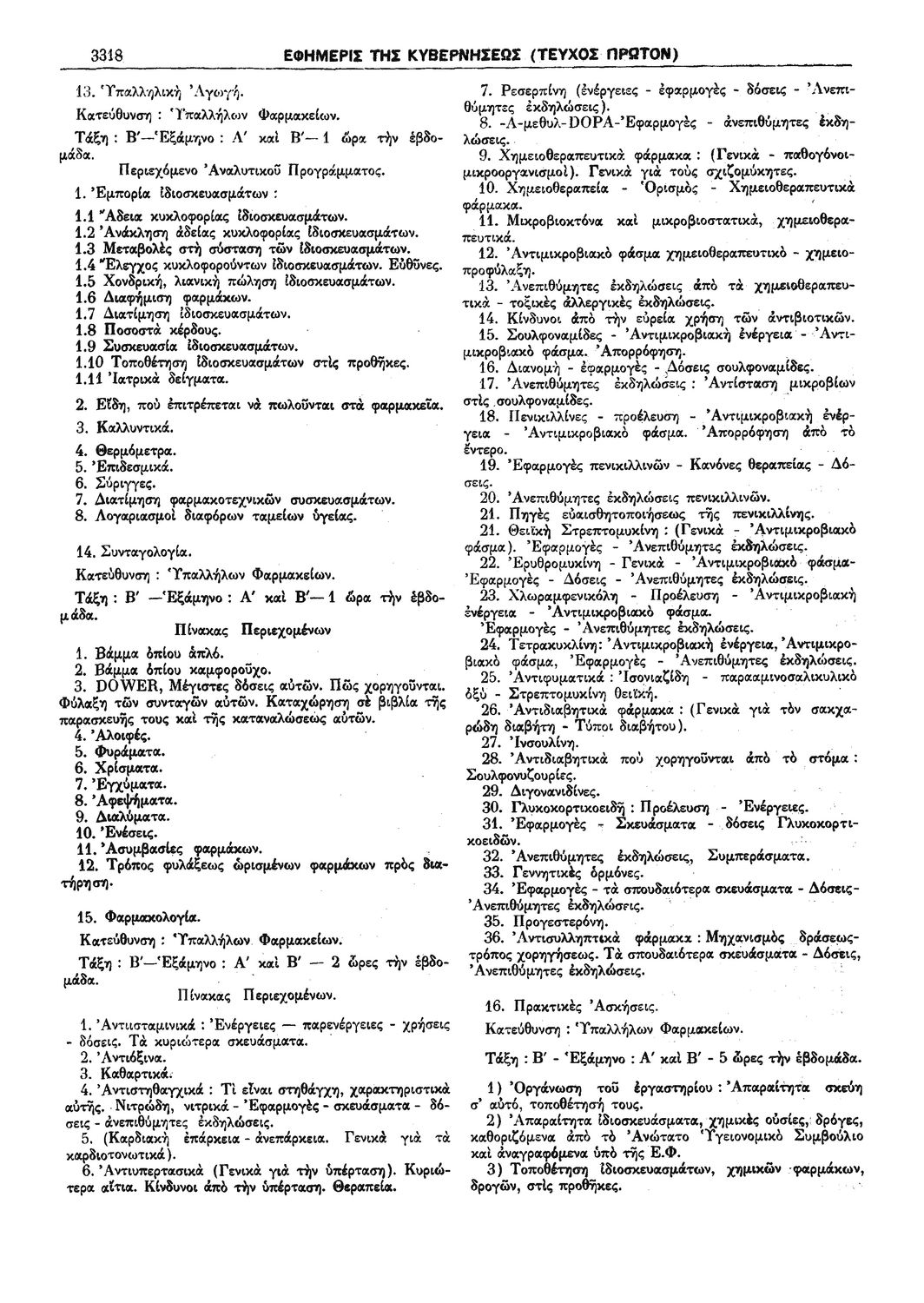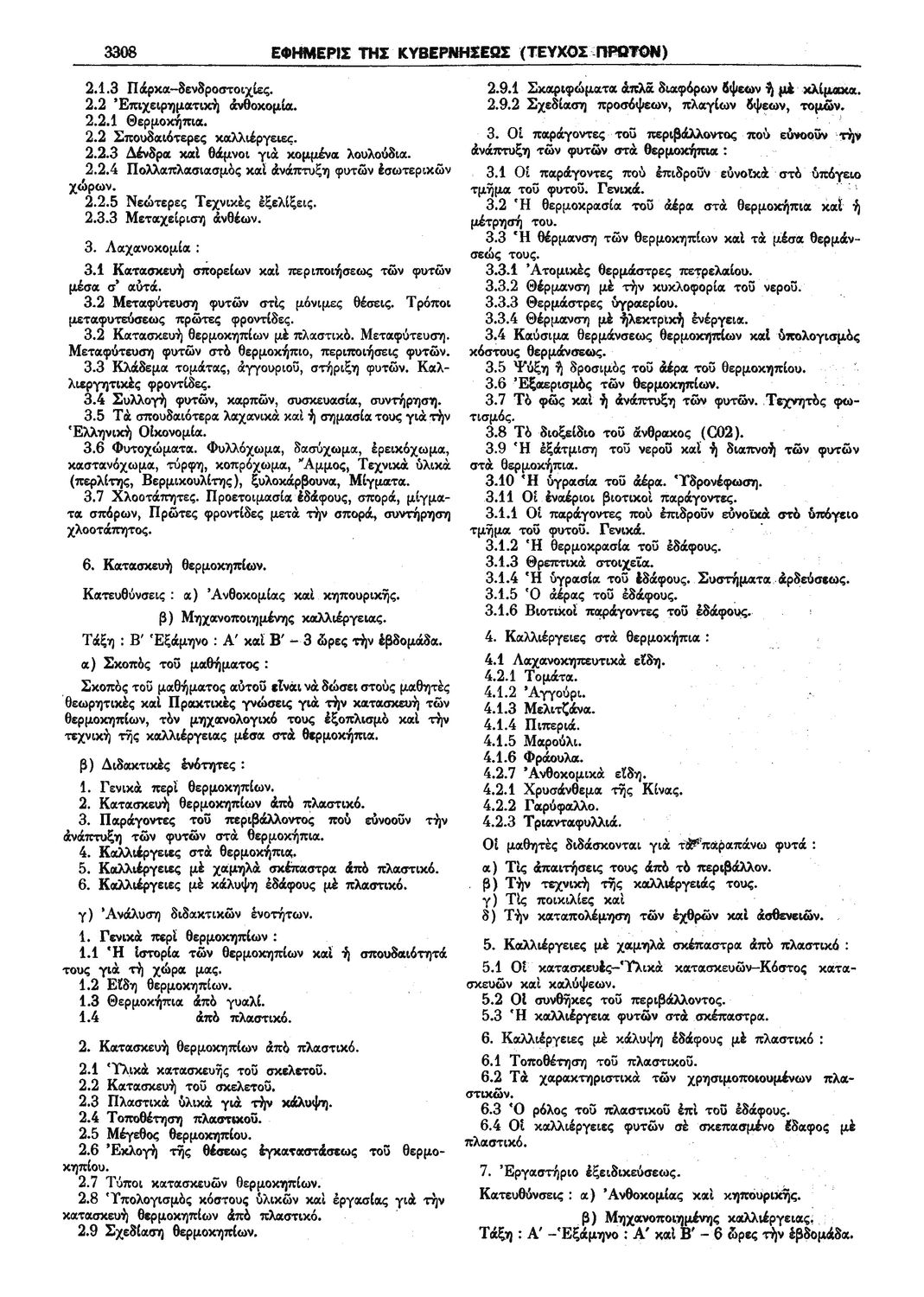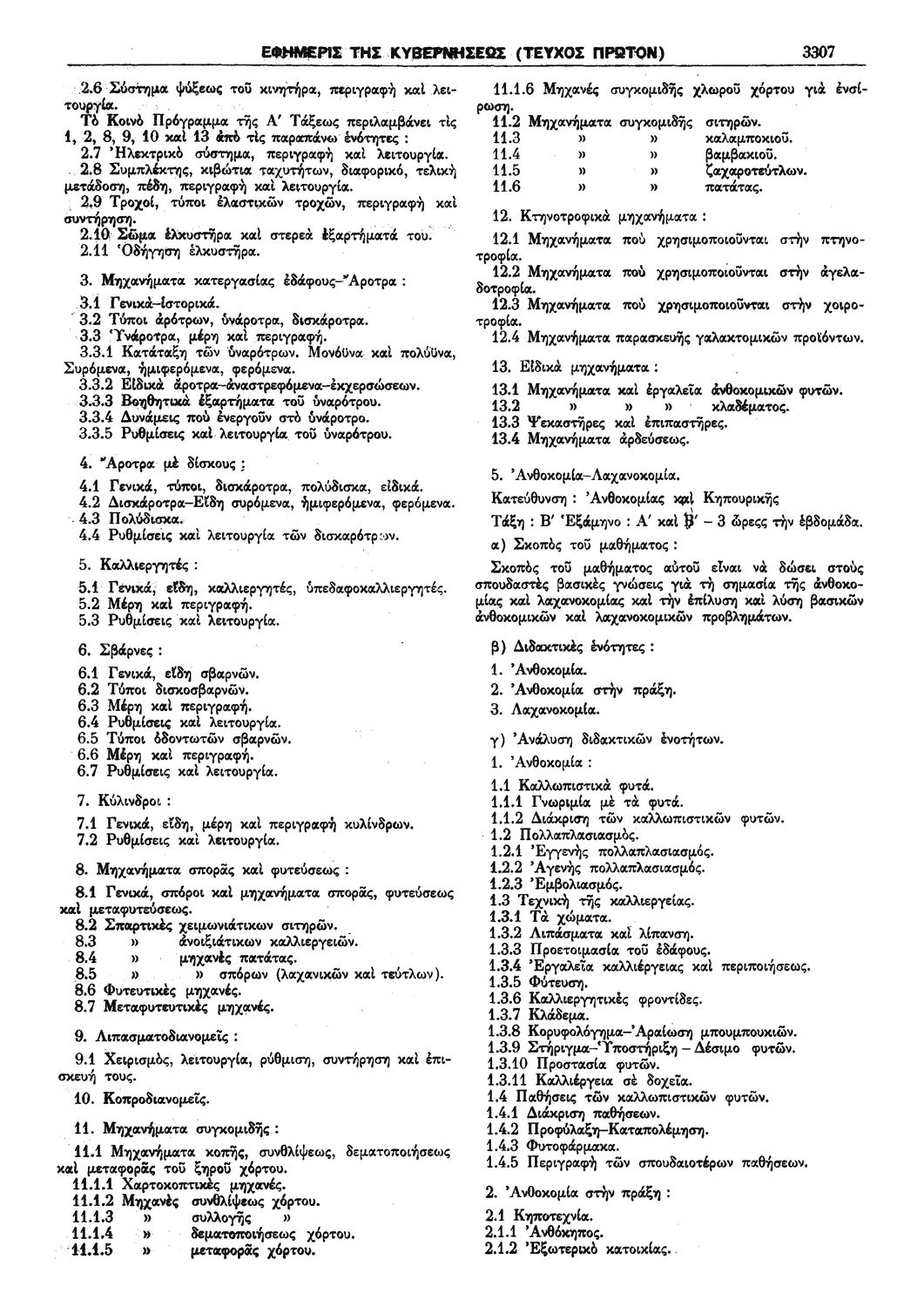 Π.Δ. 965 Περί των ωρολογίων και αναλυτικών προγραμμάτων της πρώτης και δευτέρας Τάξεως των κατευθύνσεων Ανθοκομίας - Κηπουρικής και Μηχανοποιημένης Καλλιεργείας του Γεωργοκτηνοτροφικού Τμήματος και των κατευθύνσεων Εμποροϋπαλλήλων, Υπαλλήλων Φαρμακείων και Χειριστών Διατρητικών Μηχανών και Τηλετυπικών Συσκευών του Τμήματος Υπαλλήλων Γραφείου και Εμπορικών Καταστημάτων των ημερησίων Μέσων Επαγγελματικών Σχολών.