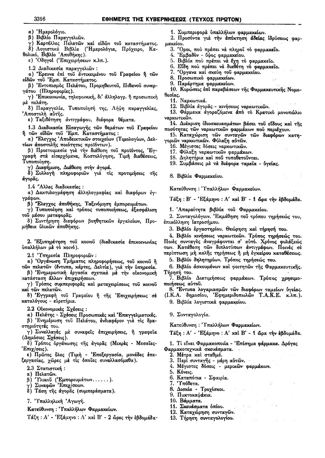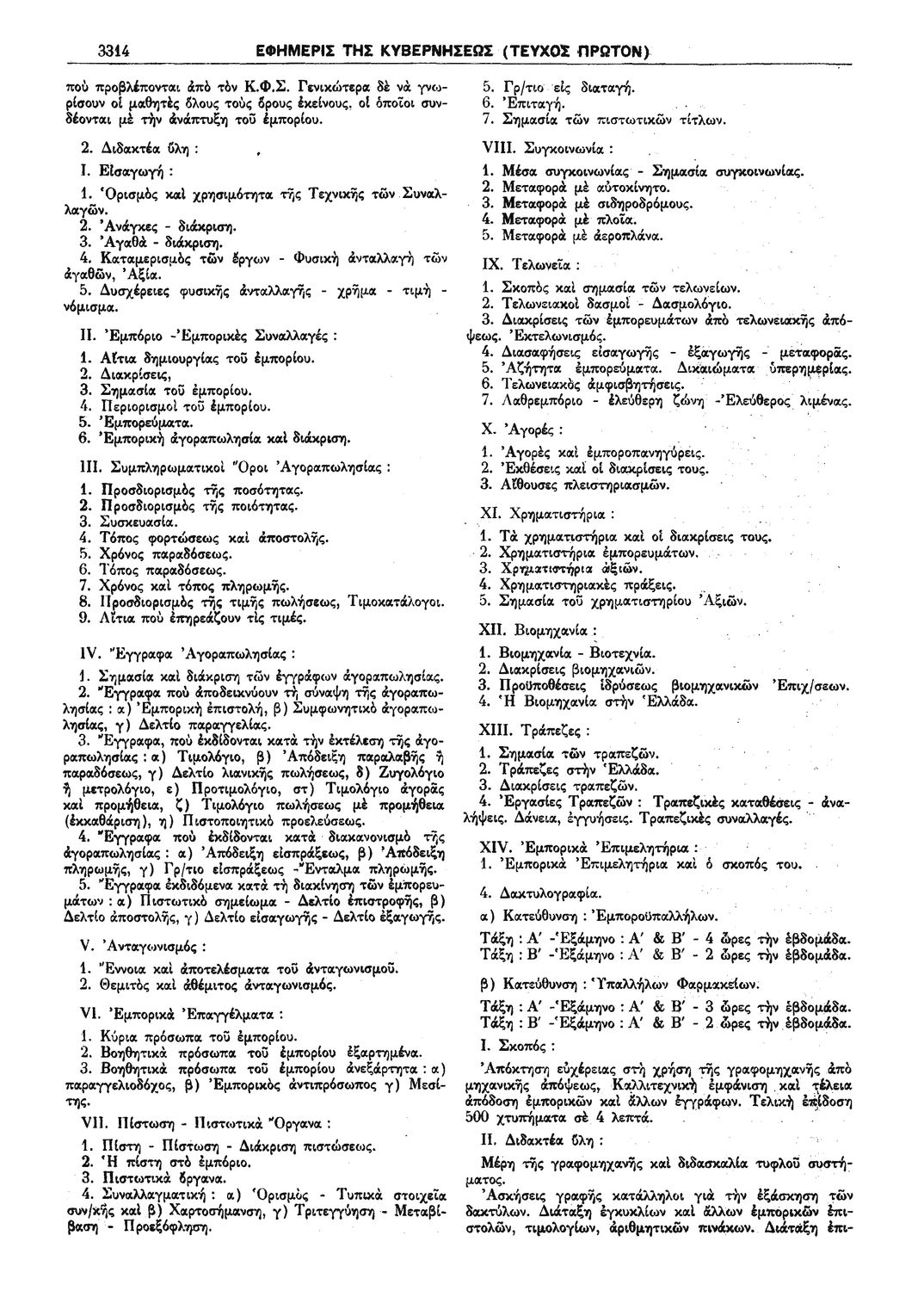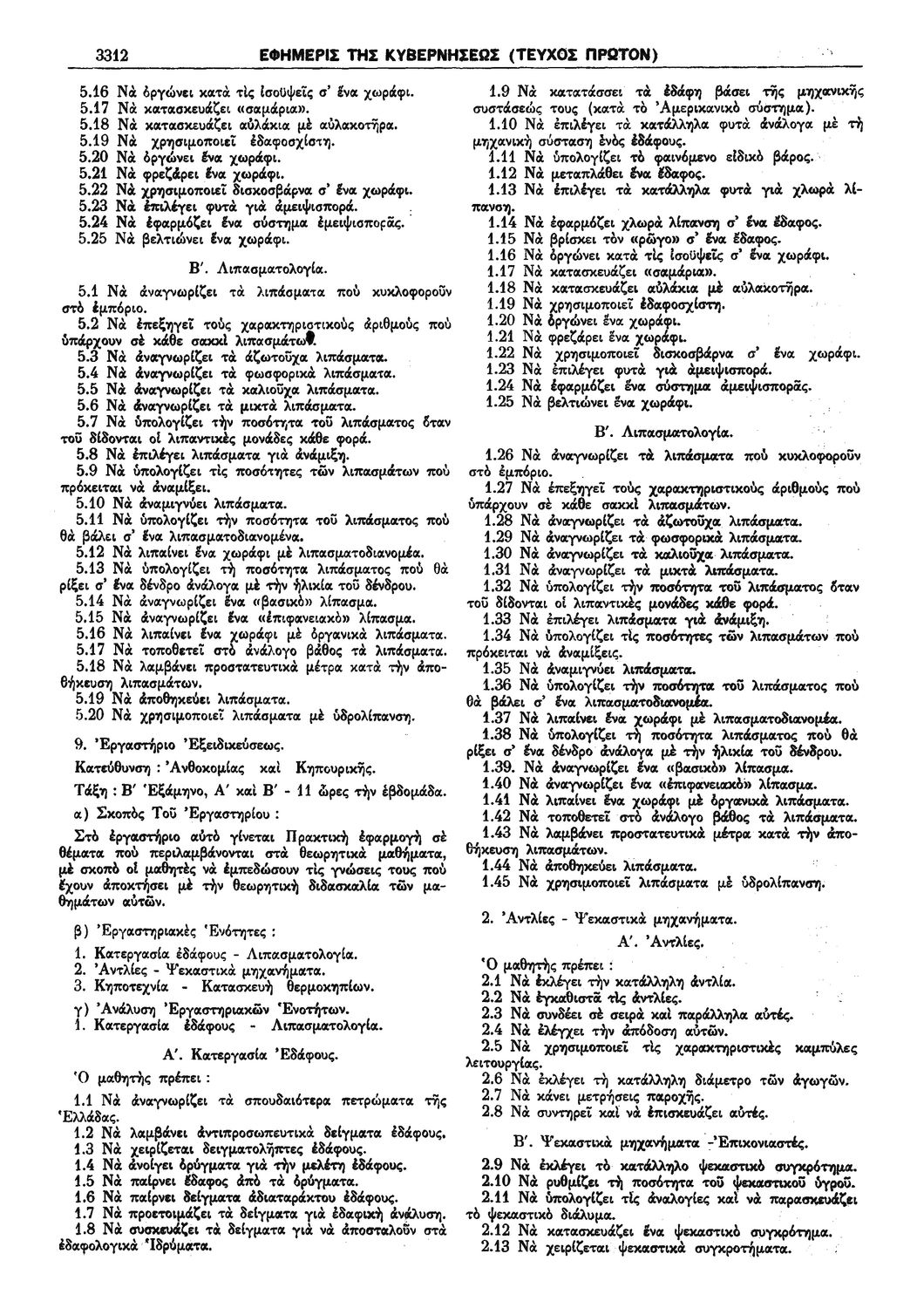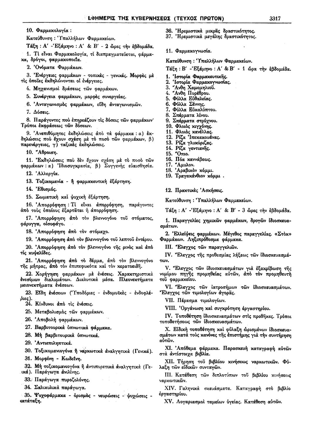 Π.Δ. 965 Περί των ωρολογίων και αναλυτικών προγραμμάτων της πρώτης και δευτέρας Τάξεως των κατευθύνσεων Ανθοκομίας - Κηπουρικής και Μηχανοποιημένης Καλλιεργείας του Γεωργοκτηνοτροφικού Τμήματος και των κατευθύνσεων Εμποροϋπαλλήλων, Υπαλλήλων Φαρμακείων και Χειριστών Διατρητικών Μηχανών και Τηλετυπικών Συσκευών του Τμήματος Υπαλλήλων Γραφείου και Εμπορικών Καταστημάτων των ημερησίων Μέσων Επαγγελματικών Σχολών.