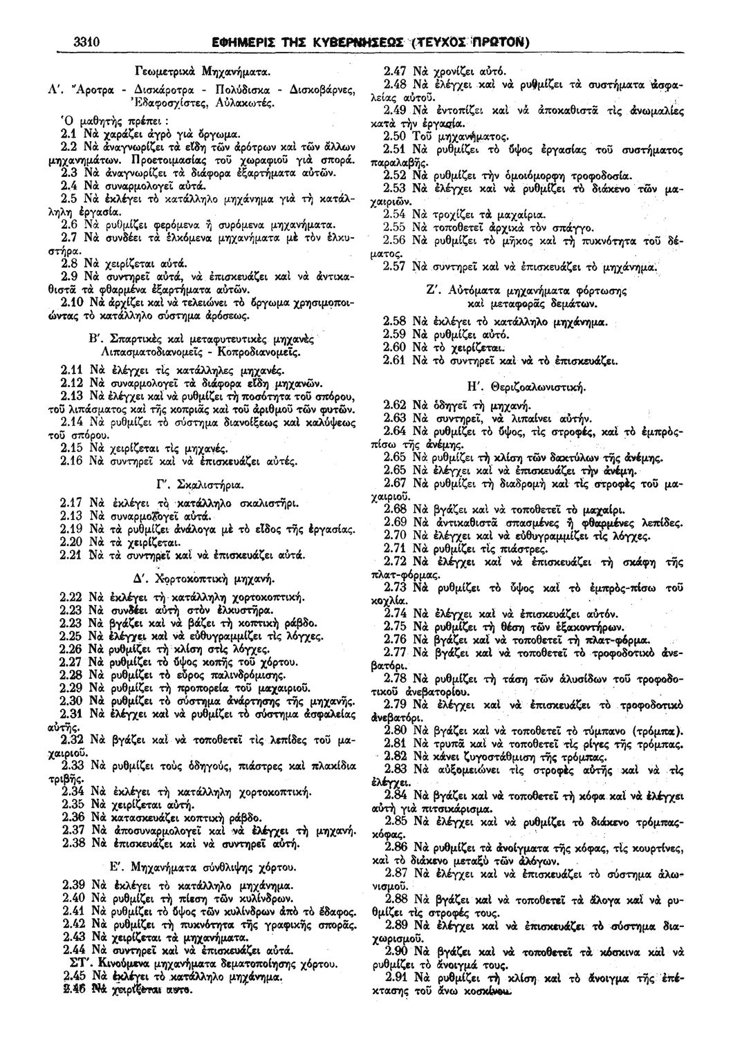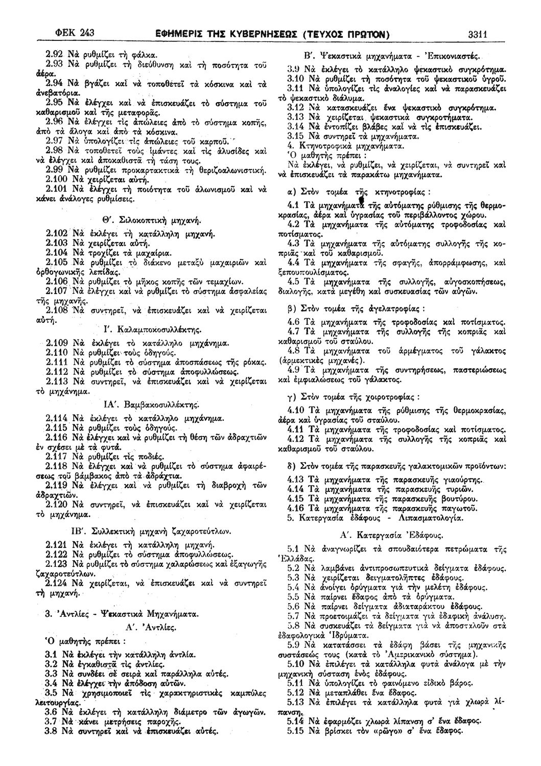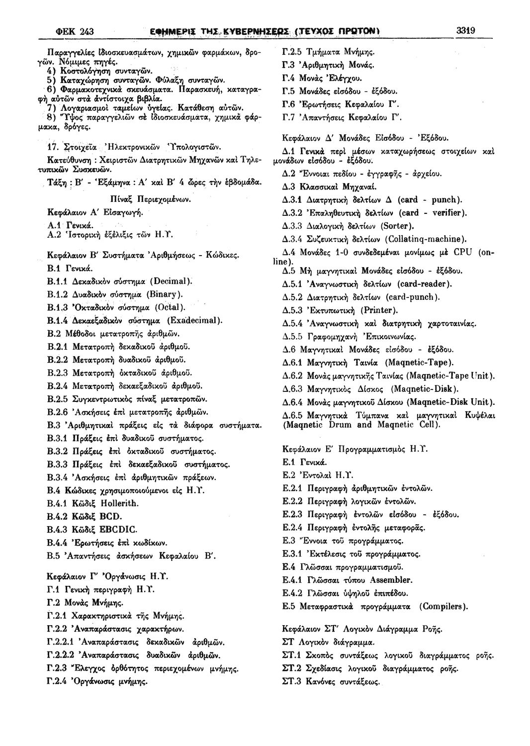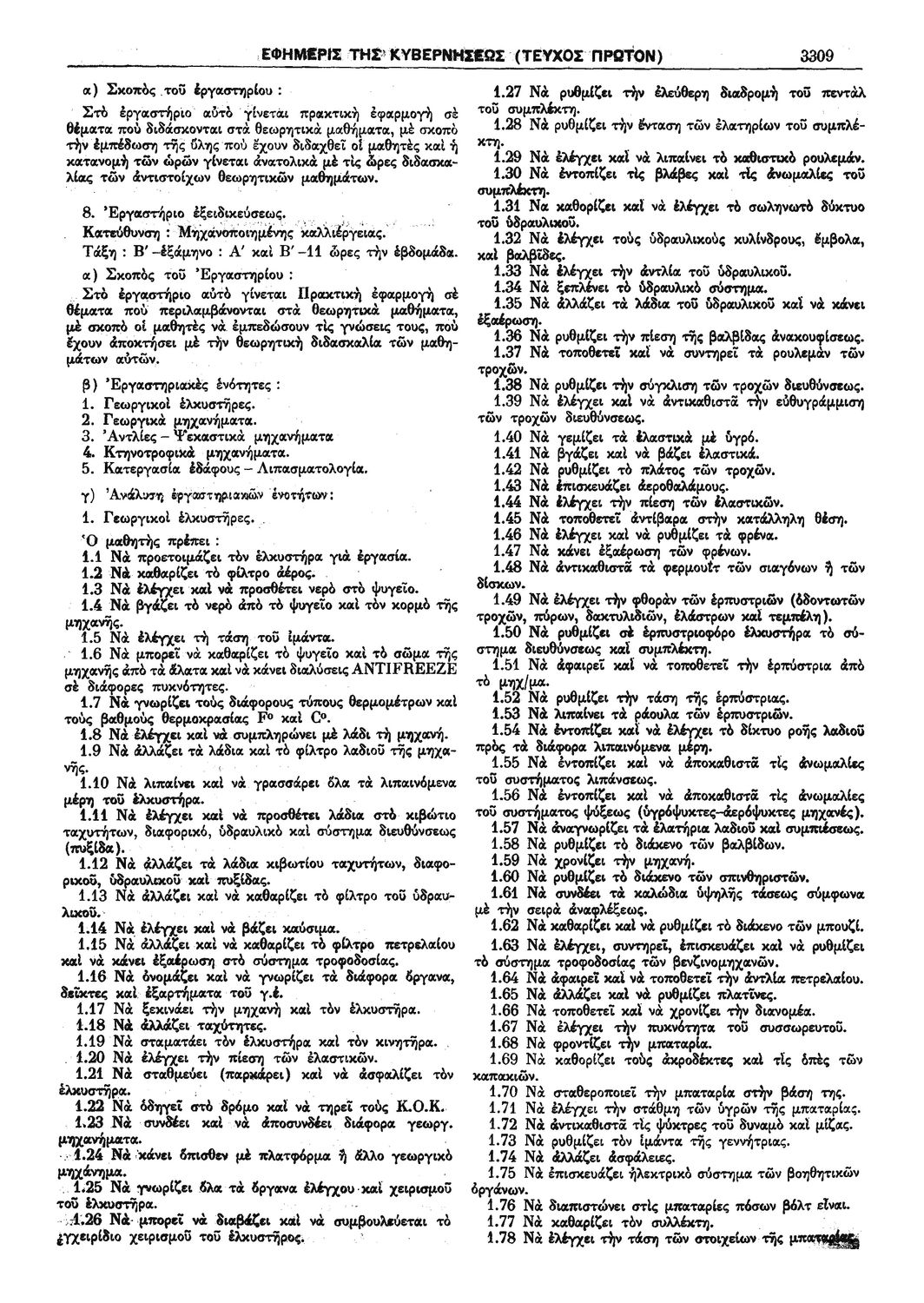 Παρουσίαση περιεχομένου: Π.Δ. 965 Περί των ωρολογίων και αναλυτικών προγραμμάτων της πρώτης και δευτέρας Τάξεως των κατευθύνσεων Ανθοκομίας - Κηπουρικής και Μηχανοποιημένης Καλλιεργείας του Γεωργοκτηνοτροφικού Τμήματος και των κατευθύνσεων Εμποροϋπαλλήλων, Υπαλλήλων Φαρμακείων και Χειριστών Διατρητικών Μηχανών και Τηλετυπικών Συσκευών του Τμήματος Υπαλλήλων Γραφείου και Εμπορικών Καταστημάτων των ημερησίων Μέσων Επαγγελματικών Σχολών. Σχετικές σελίδες: 1-18 |