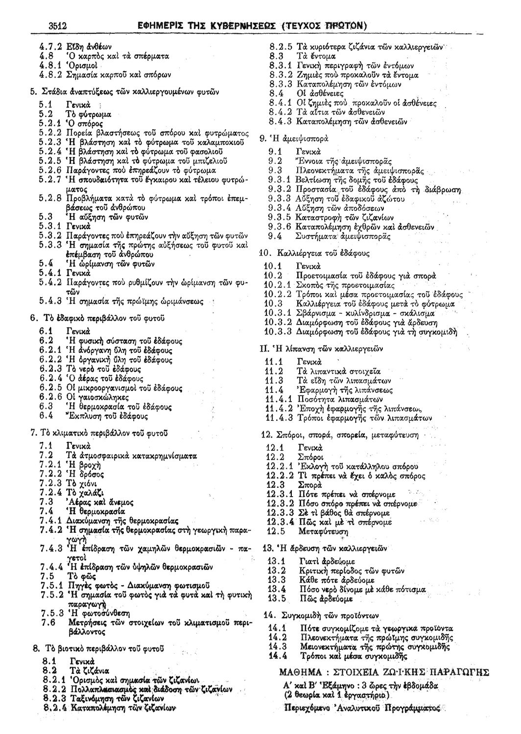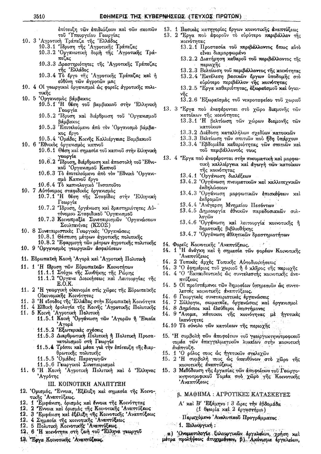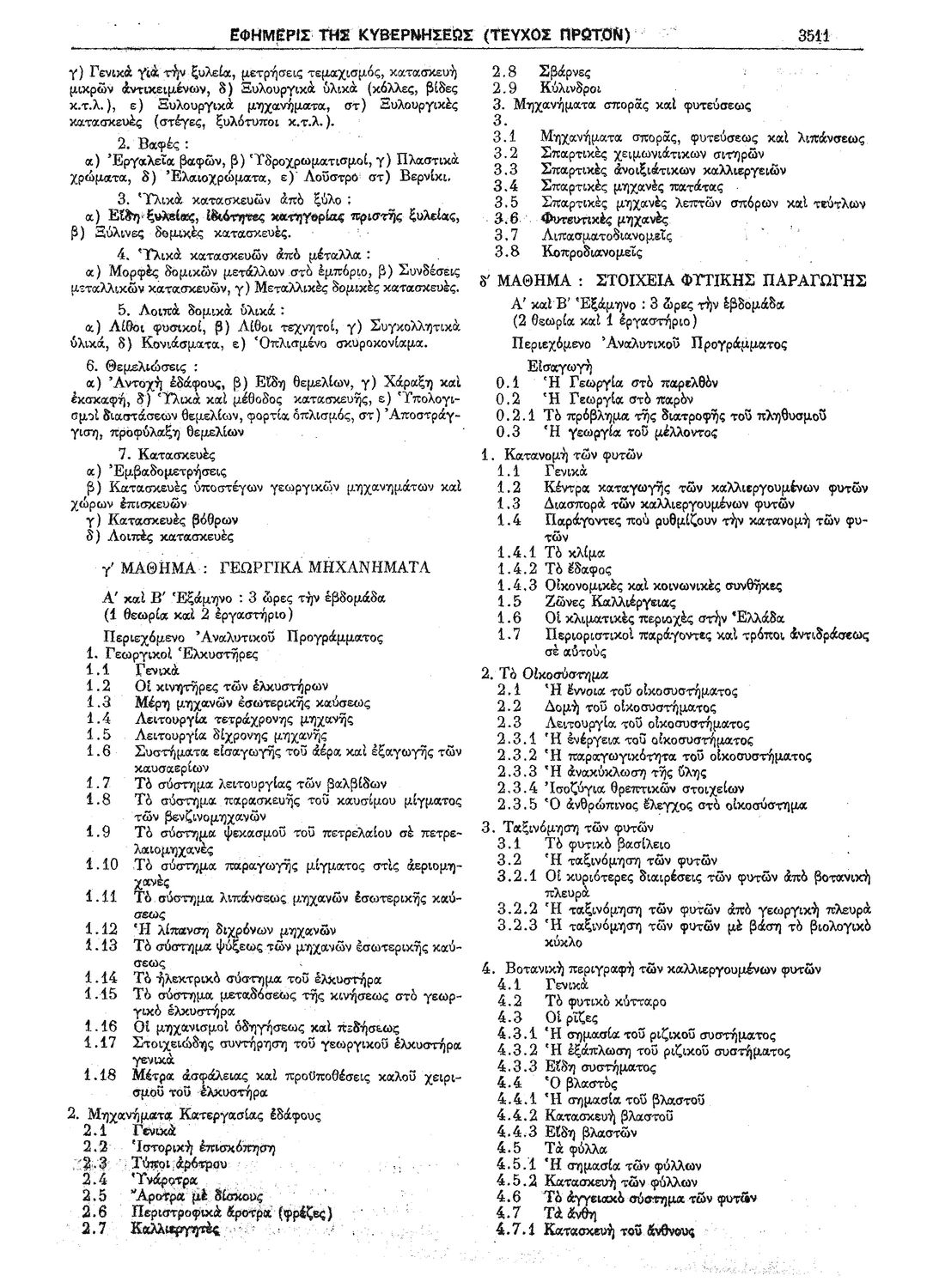 Π.Δ. 965 Περί των ωρολογίων και αναλυτικών προγραμμάτων της πρώτης και δευτέρας Τάξεως των κατευθύνσεων Ανθοκομίας - Κηπουρικής και Μηχανοποιημένης Καλλιεργείας του Γεωργοκτηνοτροφικού Τμήματος και των ...