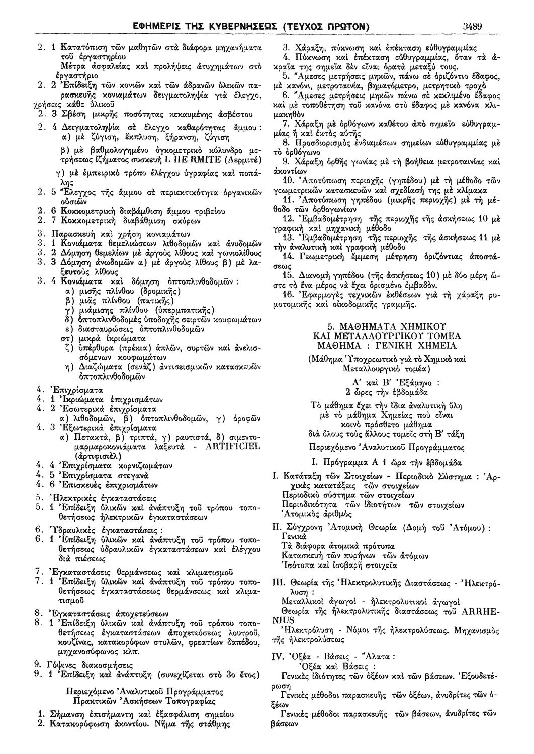 Π.Δ. 293 Περί των Ωρολογίων και Αναλυτικών Προγραμμάτων της Πρώτης (Α') και Δευτέρας (Β') τάξεως των Ημερησίων Μέσων Τεχνικών Σχολών κατά τμήμα