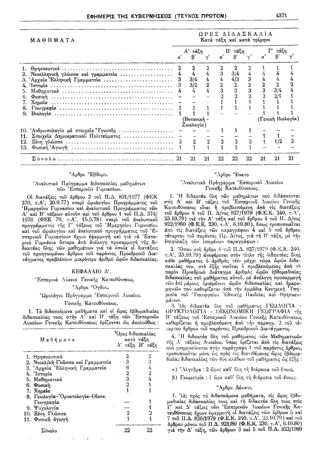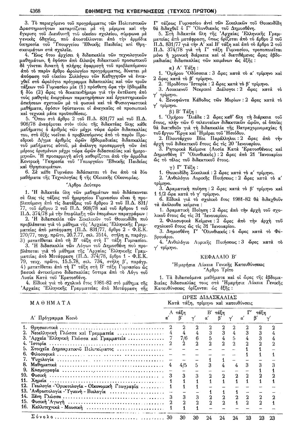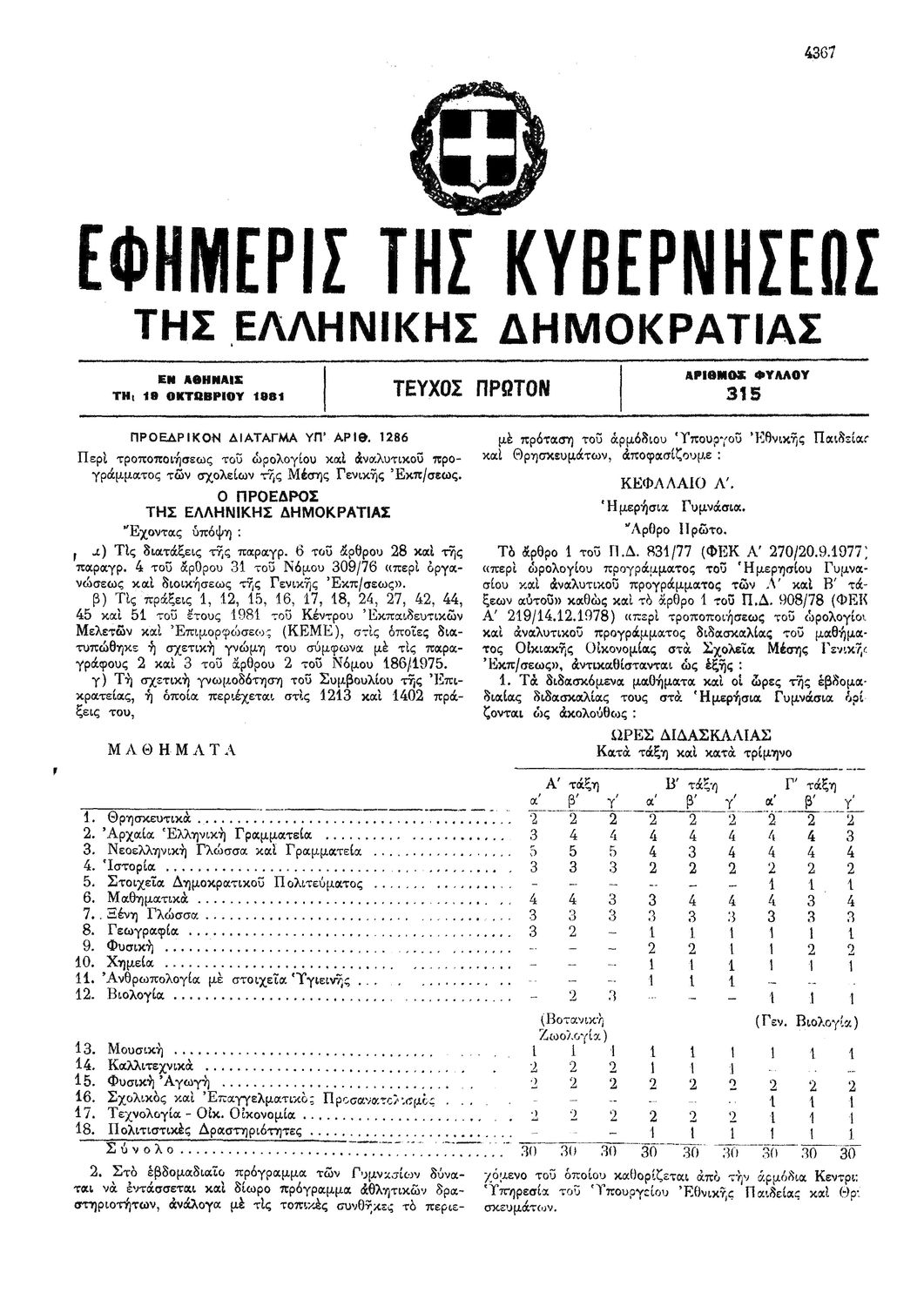 Π.Δ. 1286 Περί τροποποιήσεως του ωρολογίου και αναλυτικού προγράμματος των σχολείων της Μέσης Γενικής Εκπ/σεως