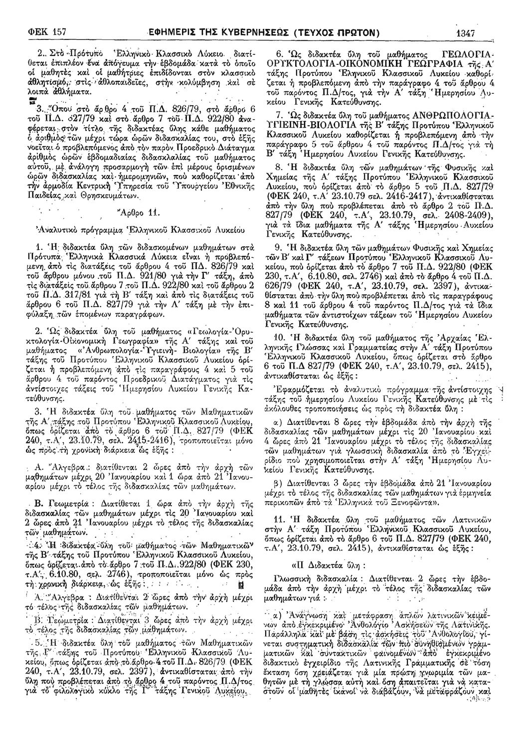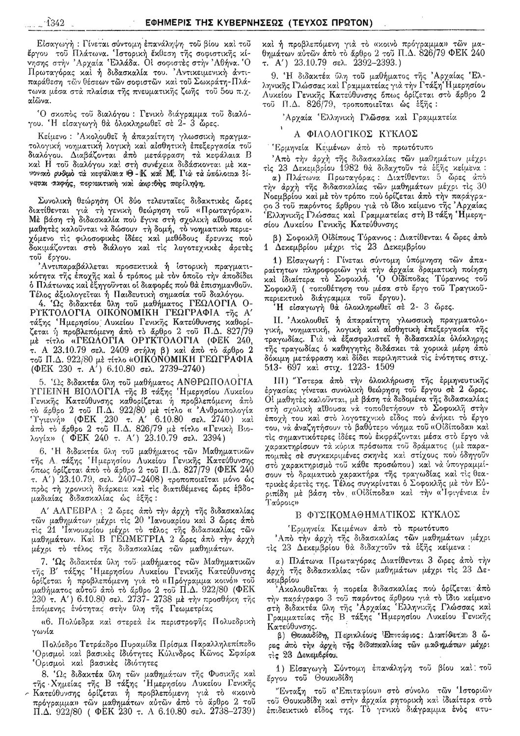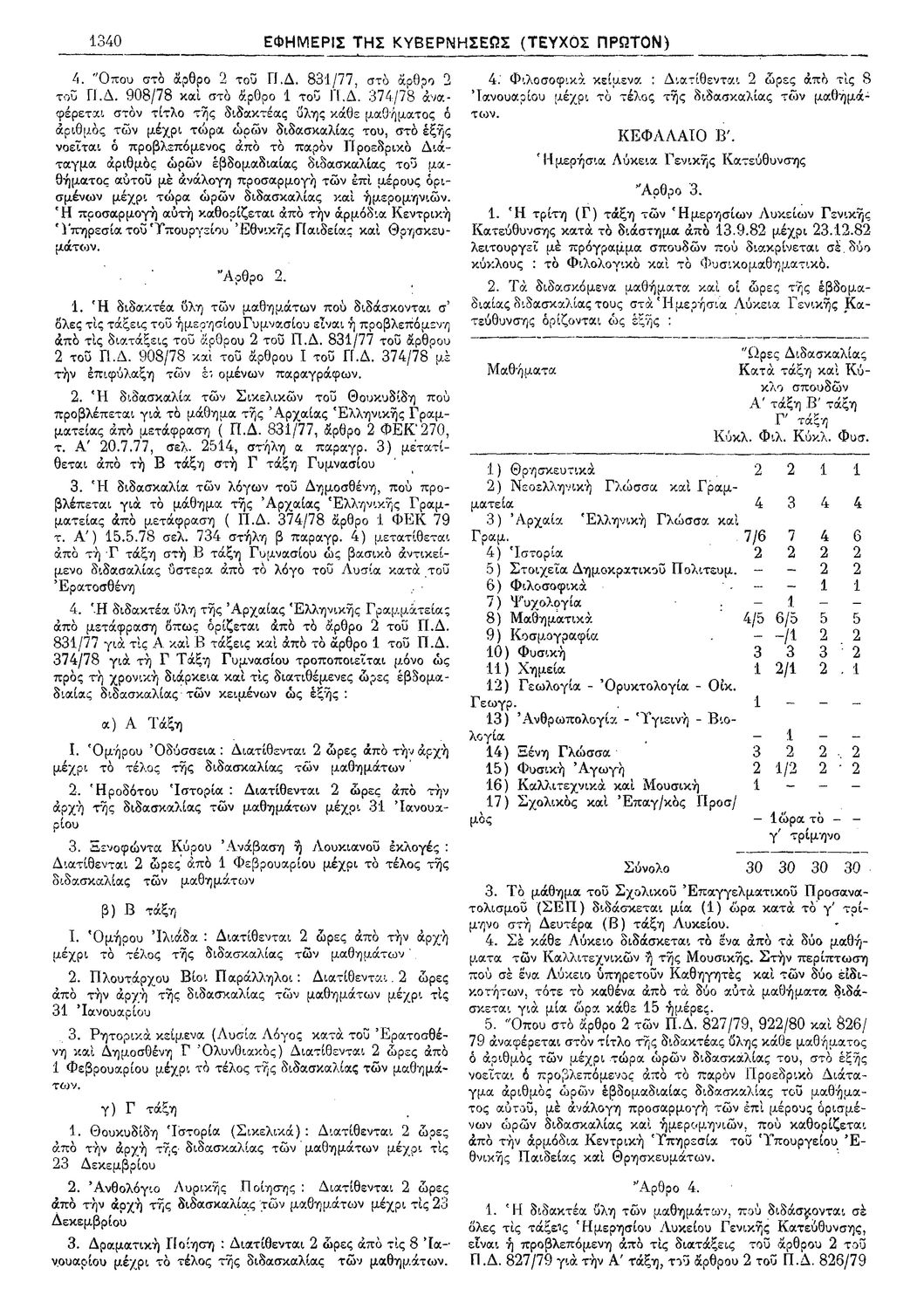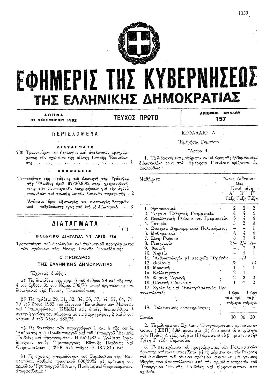 Π.Δ. 736 Τροποποίηση του ωρολογίου και αναλυτικού προγράμματος των σχολείων της Μέσης Γενικής Εκπαιδεύσεως