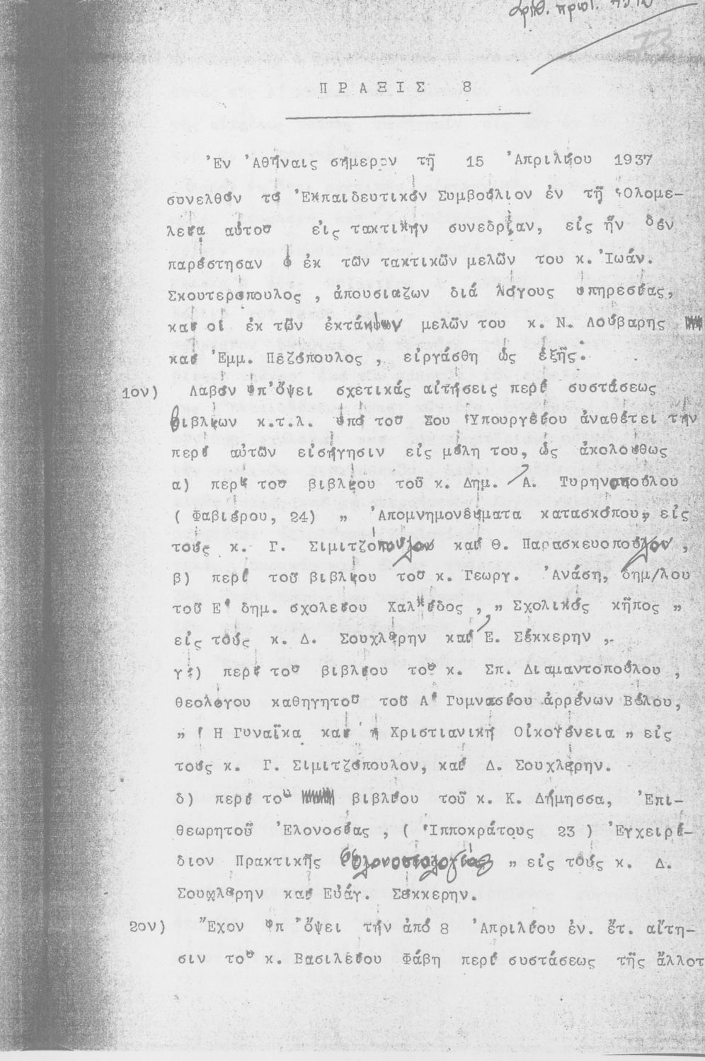 Κωδικός αναγνώρισης: 1937-0013 Τίτλος: ΚΑΘΑΡΑ ΠΡΑΚΤΙΚΑ ΟΛΟΜΕΛΕΙΑΣ ΕΚΠΑΙΔΕΥΤΙΚΟΥ ΣΥΜΒΟΥΛΙΟΥ Μέγεθος και υπόστρωμα: Πρακτικά αεσ, 136 σελίδες. |