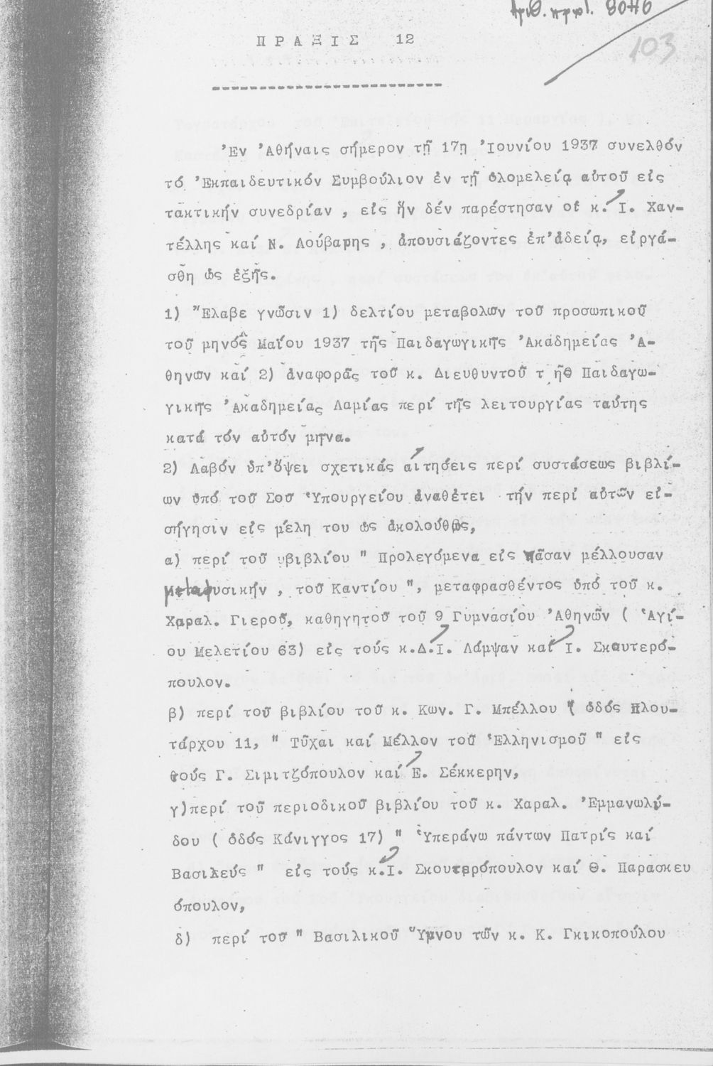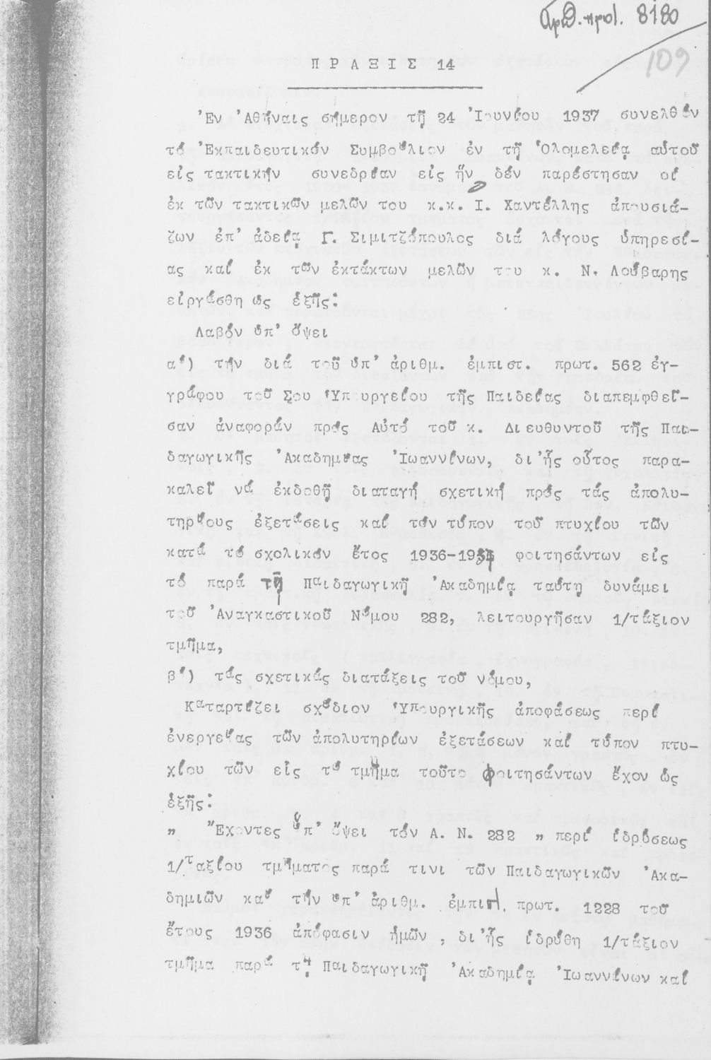 Κωδικός αναγνώρισης: 1937-0013 Τίτλος: ΚΑΘΑΡΑ ΠΡΑΚΤΙΚΑ ΟΛΟΜΕΛΕΙΑΣ ΕΚΠΑΙΔΕΥΤΙΚΟΥ ΣΥΜΒΟΥΛΙΟΥ Μέγεθος και υπόστρωμα: Πρακτικά αεσ, 136 σελίδες. |