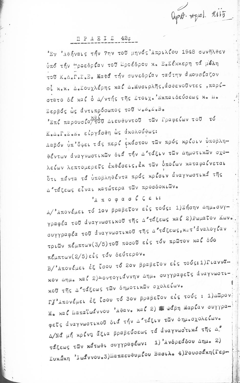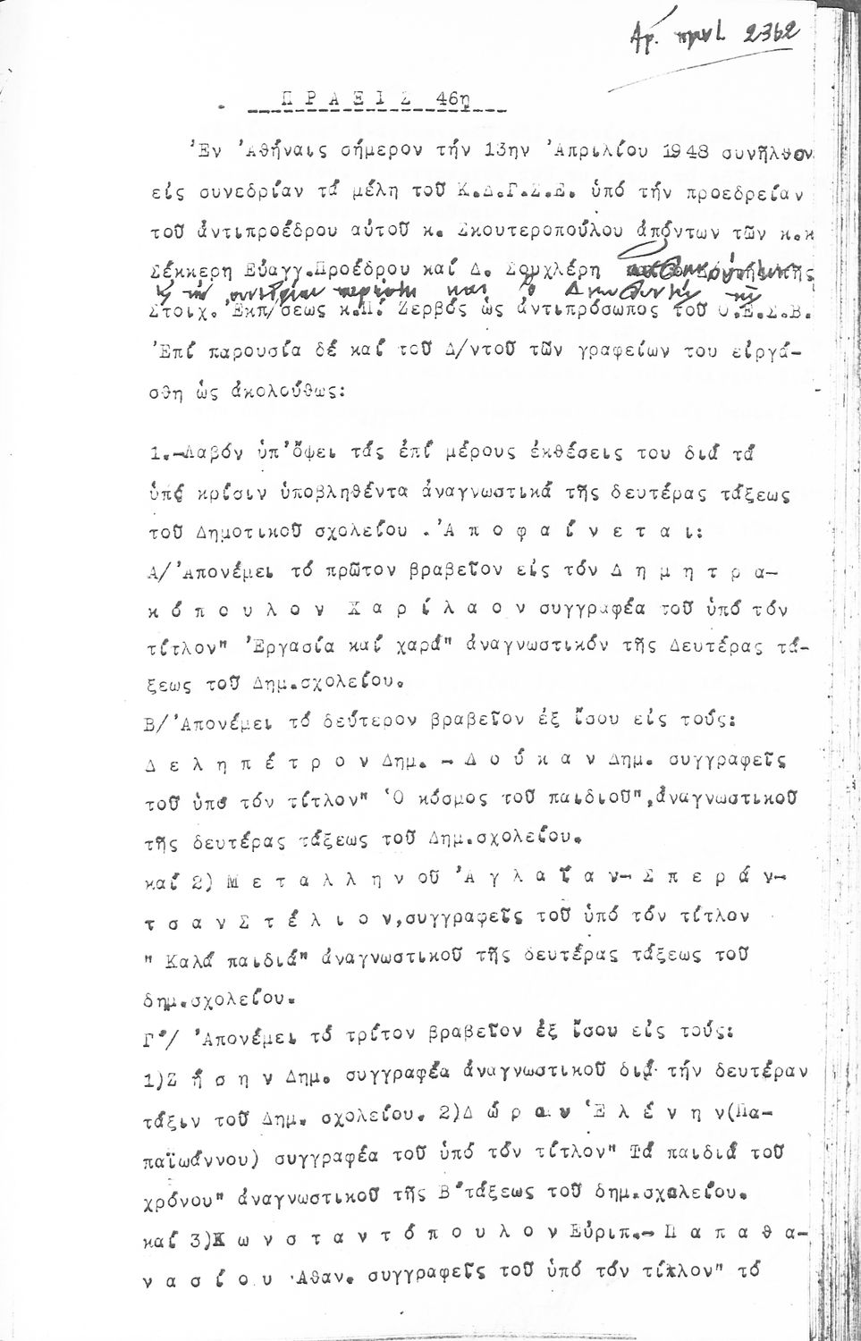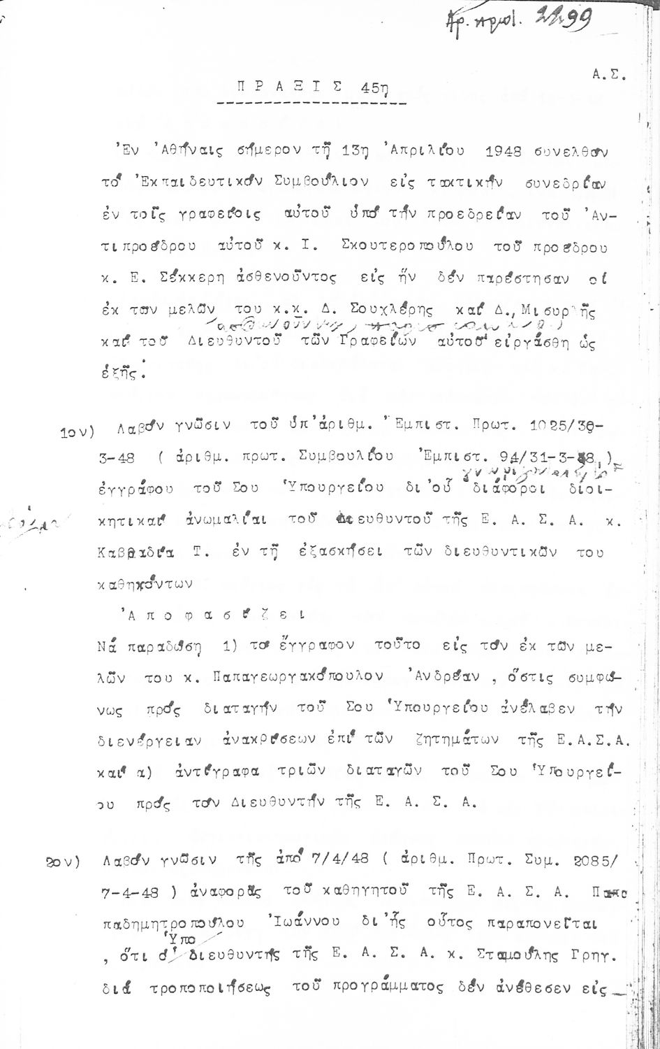 Κωδικός αναγνώρισης: 1948-0044 Τίτλος: ΠΡΑΚΤΙΚΑ ΟΛΟΜΕΛΕΙΑΣ ΕΚΠΑΙΔΕΥΤΙΚΟΥ ΣΥΜΒΟΥΛΙΟΥ Μέγεθος και υπόστρωμα: Πρακτικά αεσ, 317 σελίδες. |